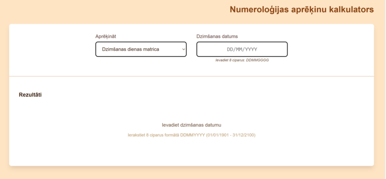Numeroloģiskiem aprēķiniem Latvijas Numerologu biedrībā ir radīts lielisks instruments numeroloģisks kalkulators. To var izmantot, rēķinot cilvēka dzimšanas datus. Kalkulators nesniedz interpretāciju par iegūtajiem datiem.