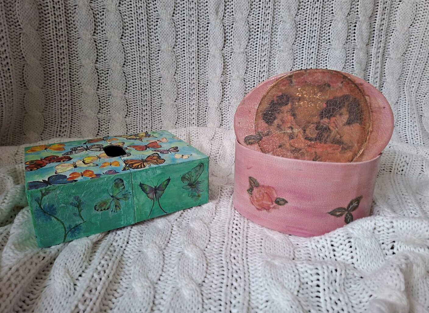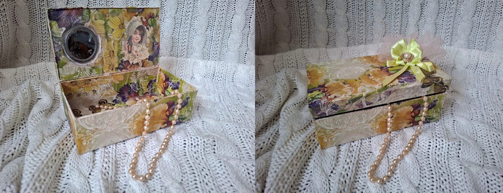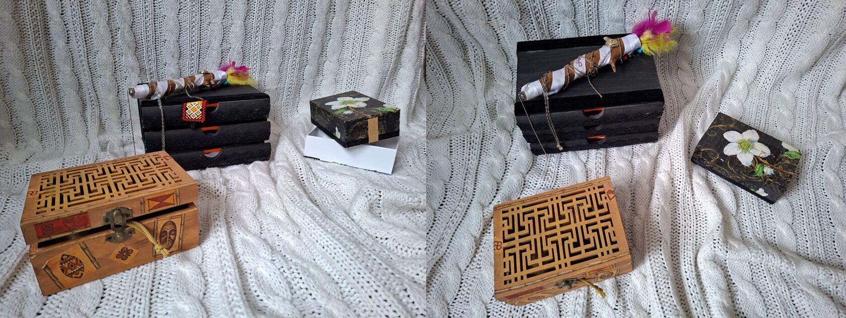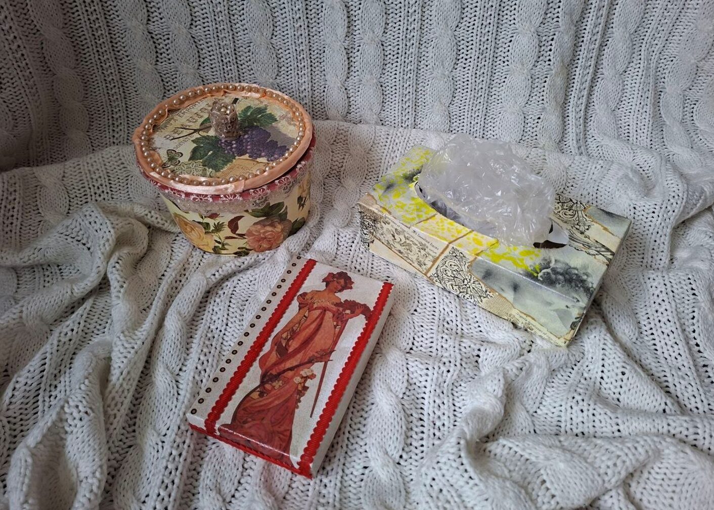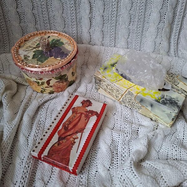 Kastītes ir mani mīļākie apdarināmie materiāli, tām ir tik daudz dažādu formu un izmēru. Mūsdienās ražotāji cenšas iepakojumu darināt ļoti kvalitatīvu - ar magnētiem, no cieta kartona utt. Nu, ļoti man patīk to visu ietērpt krāsās, salvetēs, zeltījumā. Šad tad nopērku hobija veikalos arī gatavas kastes un paplātes.